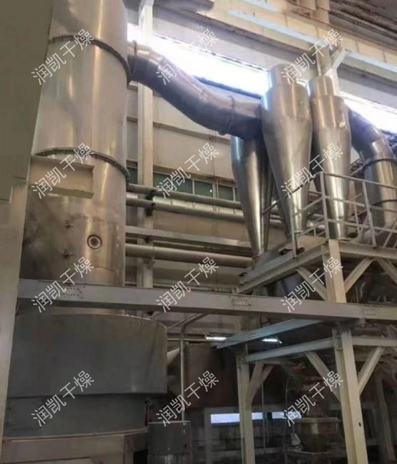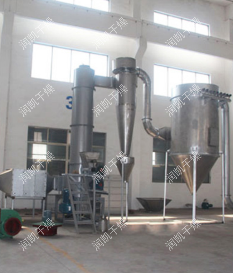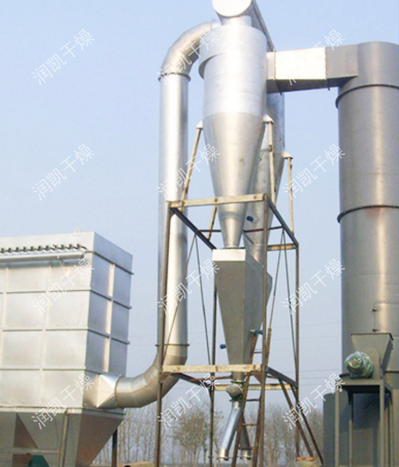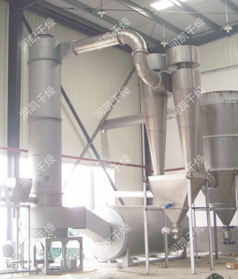 干燥氣體進入干燥機底部,產(chǎn)生強烈的旋轉(zhuǎn)氣流,對器壁上物料產(chǎn)生強烈的沖刷帶出作用,消除粘壁現(xiàn)象。 在干燥機低部高溫區(qū),熱敏性物料不與熱表面直接接觸,并裝有特殊裝置,解決了熱敏性物料的焦化變色問題。